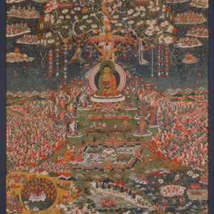 Painting shown above: Amitabha, the Buddha of the Western Pure Land (Sukhavati). C. 1700  Central Tibet;  Distemper with gold on cloth,. Dimensions: 56 1/4 × 39 1/2 in. (142.9 × 100.3 cm). Public domain – Metropolitan Museum of Art, New York. Purchased: Barbara and William Karatz Gift and funds from various donors, 2004