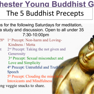 Saturday, 28th February, 7.30pm - Do no harm Saturday, 21st March, 7.30pm - Not taking the not given Saturday, 25th April, 7.30pm - Sex, Love and Simplicity Saturday, 23rd May, 7.30pm - Truthful Speech Saturday, 27th June, 7.30pm - Intoxication and Mindfulness